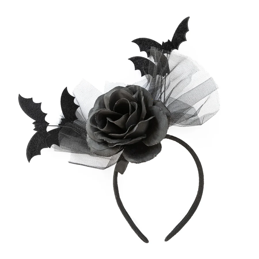 A headband for an elegant lady. Decorated with a black rose and tulle and four bats. The bats and the edges of the rose petals beautifully shimmer with glitter.