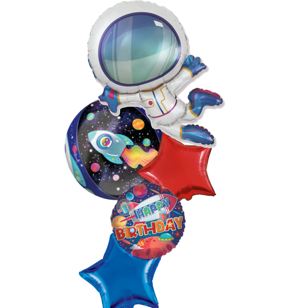 Space Odyssey Bouquet consists of x1 supershape astronaut x1 space orbz x2 star foils 18inch and x1 space foil 18inch.