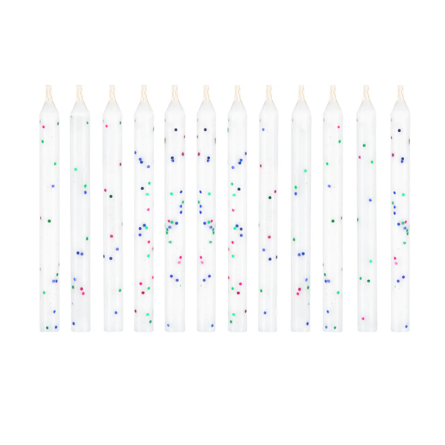 Unextinguished birthday candles white with coloured glitter 12 pcs.