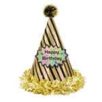6 pc Birthday hat with pompom Happy Birthday striped black and gold