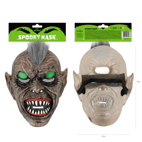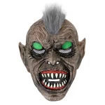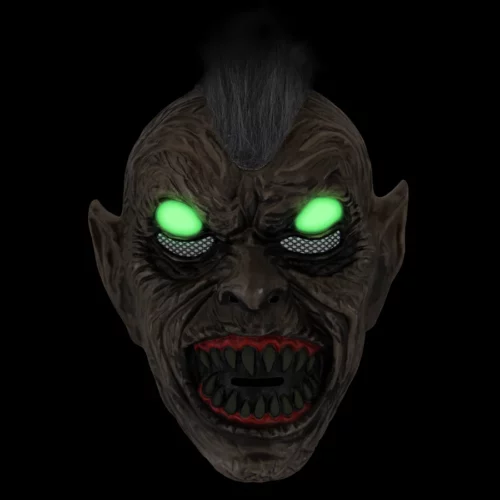 The goblin mask with green fluorescent eyes that glow in the dark and pointed teeth is another spooky costume option for Halloween and costume parties.Â
