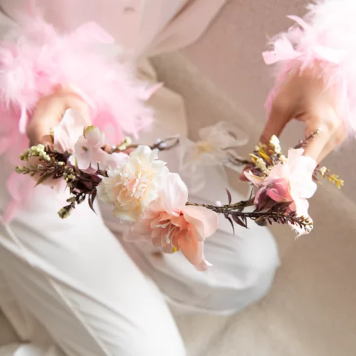 A beautiful head wreath with flowers in peach, pink and ecru colors, additionally decorated with small twigs with brown leaves and white flowers. Since the back has less decorations, it can be worn as a headband or easily integrated into the hairstyle.